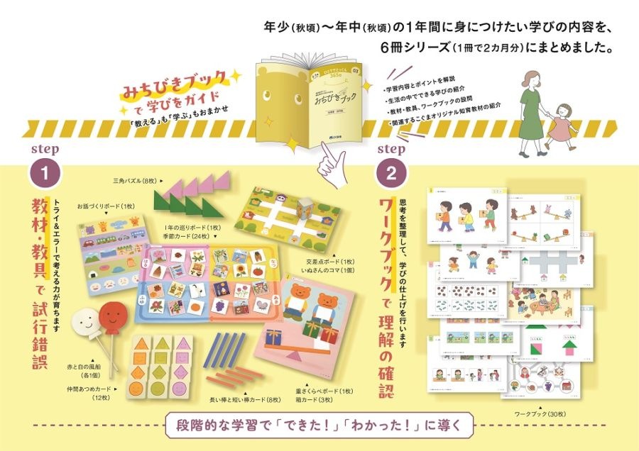 「みちびきブック」でお子さまの学びのサポートをしながら、ぜひ教材教具で何度も繰り返し、楽しい幼児期の学びを経験してください。